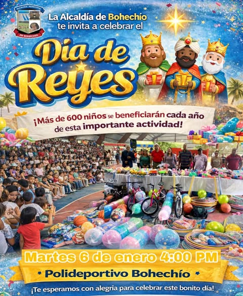 La Alcaldía Municipal de Bohechío, encabezada por el alcalde Domingo Suzaña Abreu y el Concejo de Regidores, invita a toda la población a participar en la tradicional entrega de juguetes dirigida a los niños y niñas del municipio, actividad que se llevará a cabo este martes 6 de enero de 2026.