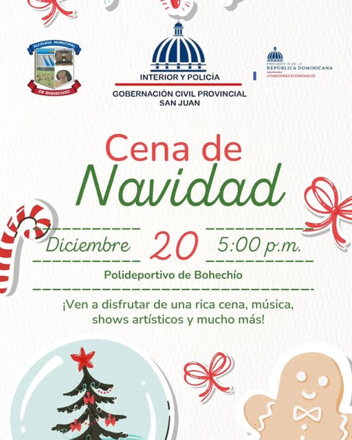 Para conmemorar esta temporada tan especial, invitamos a todo el pueblo de Bohechío a disfrutar de nuestra tradicional «Cena de Navidad», que se llevará a cabo en el Polideportivo. Este evento será una noche llena de sabrosas cenas, música en vivo, presentaciones artísticas y mucho más, diseñado para que cada uno de ustedes pueda disfrutar y compartir en armonía.