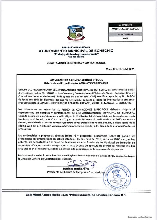 El Ayuntamiento Municipal de Bohechío hace de conocimiento público y convoca a ingenieros y empresas debidamente constituidas a participar en el proceso AMBHC-CCC-CP-2025-0003, correspondiente a la construcción del Parque Abraham Luciano, ubicado en el sector El Manguito, municipio de Bohechío, mejor conocido como el “Parque de Oliva”.
