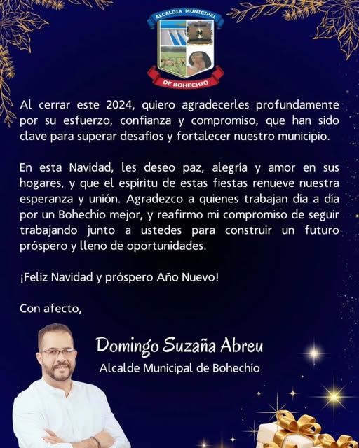 El Alcalde Domingo Suzaña Abreu les desea a todos los ciudadanos de Bohechío una Navidad llena de paz, amor y esperanza, y un próspero año nuevo 2025, lleno de bendiciones, salud y bienestar para cada uno de ustedes y sus familias.