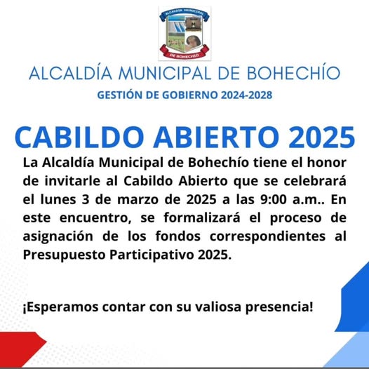 La Alcaldía de Bohechío, bajo la dirección del Lic. Domingo Suzaña Abreu, tiene el honor de invitar a toda la comunidad a participar en el cabildo abierto que se celebrará este lunes 3 de marzo de 2025, a las 9:00 de la mañana, en el Ayuntamiento Municipal.